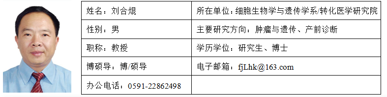 刘合焜,男,1963年10月生,理学博士,博士生导师。1984年南京大学生物系获理学学士学位,1991年南京大学生物系硕士研究生毕业获理学硕士学位,2005年四川大学医学遗传学专业博士研究生获理学博士学位,2010年麻豆视频 临床医学博士后流动站出站。现任麻豆视频 转化医学研究院副院长,细胞生物学与遗传学系教授,福建省干细胞转化医学协同创新中心副主任兼秘书长,福建省癌症和神经退行性疾病转化研究重点实验室副主任。从事细胞生物学、医学遗传学和肿瘤遗传学的教学和科研工作,尤其肿瘤遗传、遗传病、产前诊断等医学遗传学和分子遗传学研究。2002年9月至2006年2月先后在人类疾病生物治疗国家重点实验室疾病基因组研究室、国家人类基因组北方研究中心、农业生物技术国家重点实验室“畜禽基因组与分子数量遗传学创新研究群体”从事博士研究和国内访问学者。2010年和2016年两次在美国哈佛医学院卢坤平教授实验室访问学者。