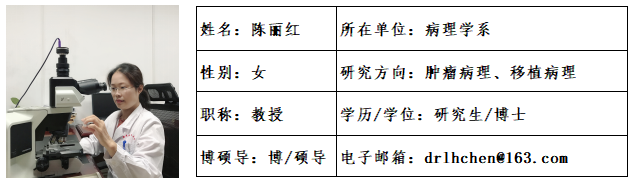 陈丽红,女,1974年8月,籍贯福建仙游,博士,教授,病理学系系主任,病理诊断中心副主任。国际肝胆胰协会中国分会MDT专业委员会常务委员,中国医学装备协会中国病理装备委员会第三届常务委员,福建省医学会病理学分会副主任委员,建省病理质控中心副主任,福建省肝病学分会常务委员。承担博士生、硕士生、本科生、海外医学生等的病理学理论课和实验课授课,并长期从事肝病病理、肝移植病理的临床诊断与研究工作,具有较丰富的肝病病理诊断经验,对肝癌和肝移植免疫耐受领域的研究情况和进展有深入的了解和掌握。曾在美国加州大学洛杉矶分校进修肝脏和肺脏病理。