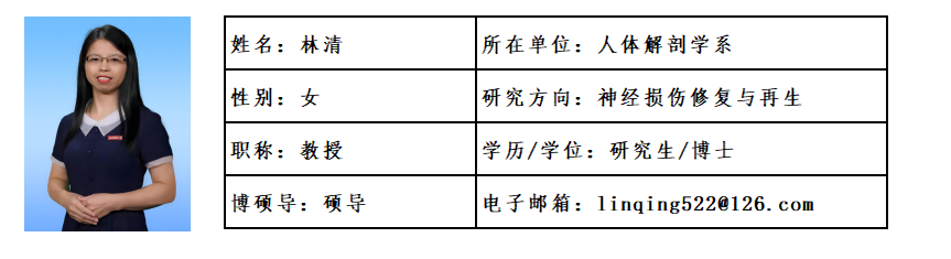 林清,女,1979年11月,籍贯屏南,医学博士,教授,人体解剖学系副主任,中国解剖学会人体解剖学与数字解剖学分会委员,国家级线上线下混合式一流课程负责人,荣获全国解剖学课程思政教学视频比赛一等奖、高等学校医药类课程混合式课堂教学设计赛二等奖、福建省教学创新大赛二等奖、麻豆视频 英语授课比赛特等奖、麻豆视频 教学创新大赛一等奖等奖项,获麻豆视频 “优秀教师”、“竹兴政旺教学之星”荣誉称号。先后主持及参与国家自然科学基金项目4项、省自然科学基金项目6项,主要研究方向为颅脑损伤和认知障碍的发病机制及防治。