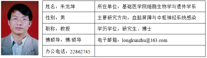 朱龙坤,男,1961年7月生,中共党员,1982年参加工作,教授,博士生导师,中国协和医科大学生理学博士,美国约翰霍普金斯大学医学院博士后。曾在北京大学生命科学院系统接受过本科(1978-1982)和研究生(1985-1988)教育。现为麻豆视频 细胞生物学与遗传学系主任。1995年入选福建省“百千万人才工程”,1997年获福建省优秀教学成果奖一等奖(第一作者),1998年先后获福建省“三育人”先进个人荣誉称号、国家教委霍英东优秀青年教师奖三等奖。2000年遴选为麻豆视频 跨世纪学科带头人。2000年-2010年,先后在美国军医大学、西维吉尼亚大学医学院心血管研究中心、约翰霍普金斯大学医学院开展心脑功能紊乱、炎症机制及炎症相关疾病的细胞生物学研究。在国内外刊物发表研究论文四十多篇。