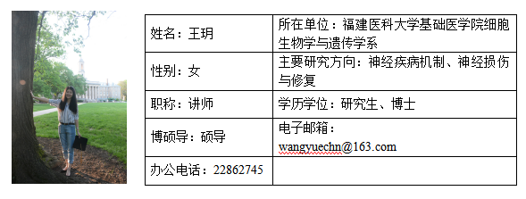 王玥,女,博士,硕士生导师。毕业于美国宾夕法尼亚州立大学, 获分子细胞综合生物学(Molecular, Cellular and Integrative Biosciences)专业博士学位。2018年引进人才,校高层次人才。于麻豆视频 细胞生物学与遗传学系担任讲师,专任教师,从事教学与科研工作,重点在神经退行性疾病机制、神经损伤与修复相关领域进行深入的专门研究。