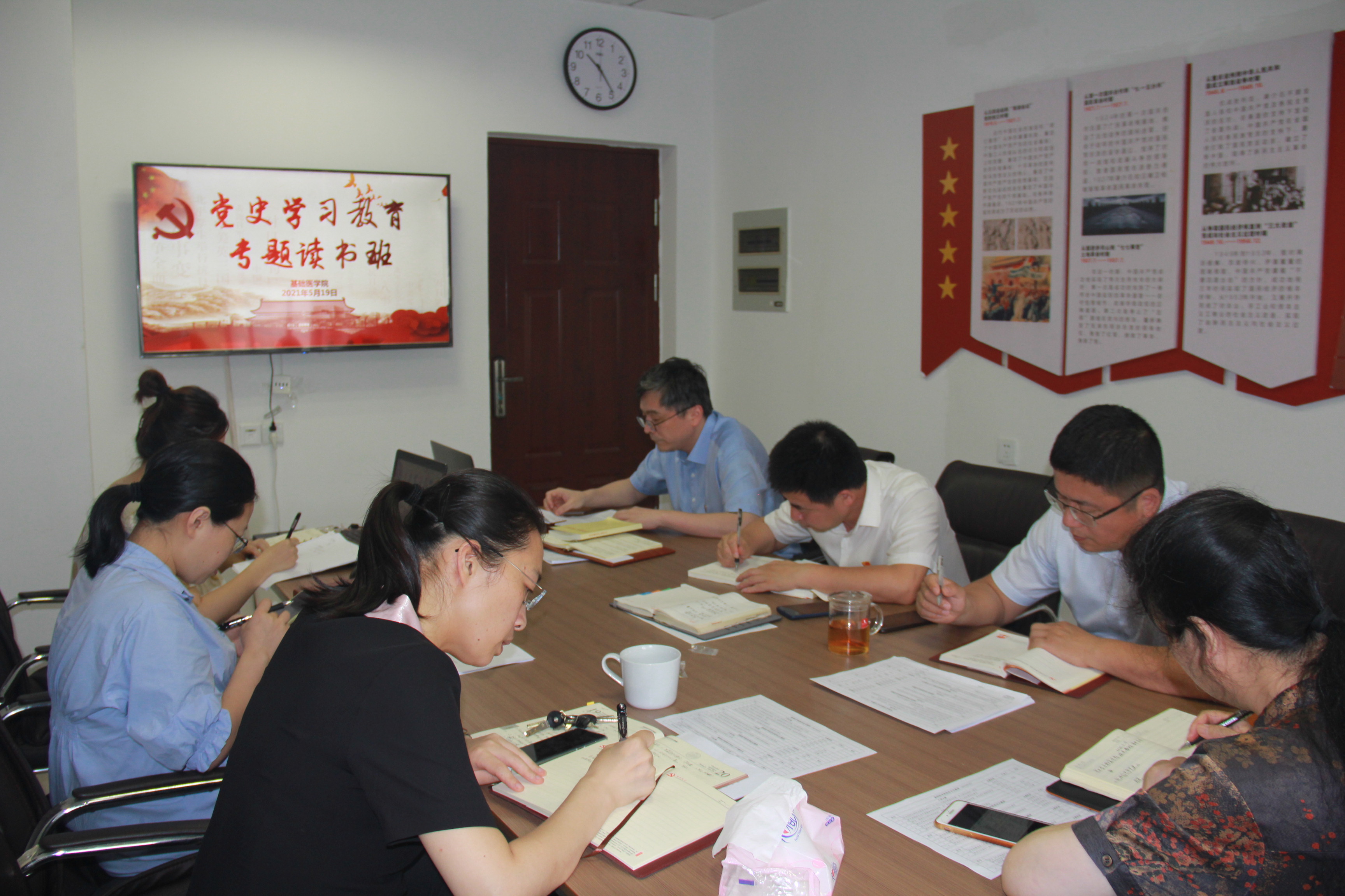 为深入学习习近平新时代中国特色社会主义思想、进一步推动党史学习教育走深走实,形成领导示范带动全员学党史、悟思想、办实事、开新局的浓厚氛围。5月19日,麻豆视频 在2#301举行党史学习教育专题读书班开班式。开班仪式中,学院党委书记何颖义介绍了读书班的学员组成、学习形式和具体安排,并要求领导干部要以身作则、率先垂范,增强学习的政治自觉、思想自觉和行动自觉,以科学理论武装头脑、指导实践、推动发展,做到以史鉴今、明理增信、崇德力行。开班仪式后,党委领导班子集中学习了《论中国共产党历史》并进行研讨。