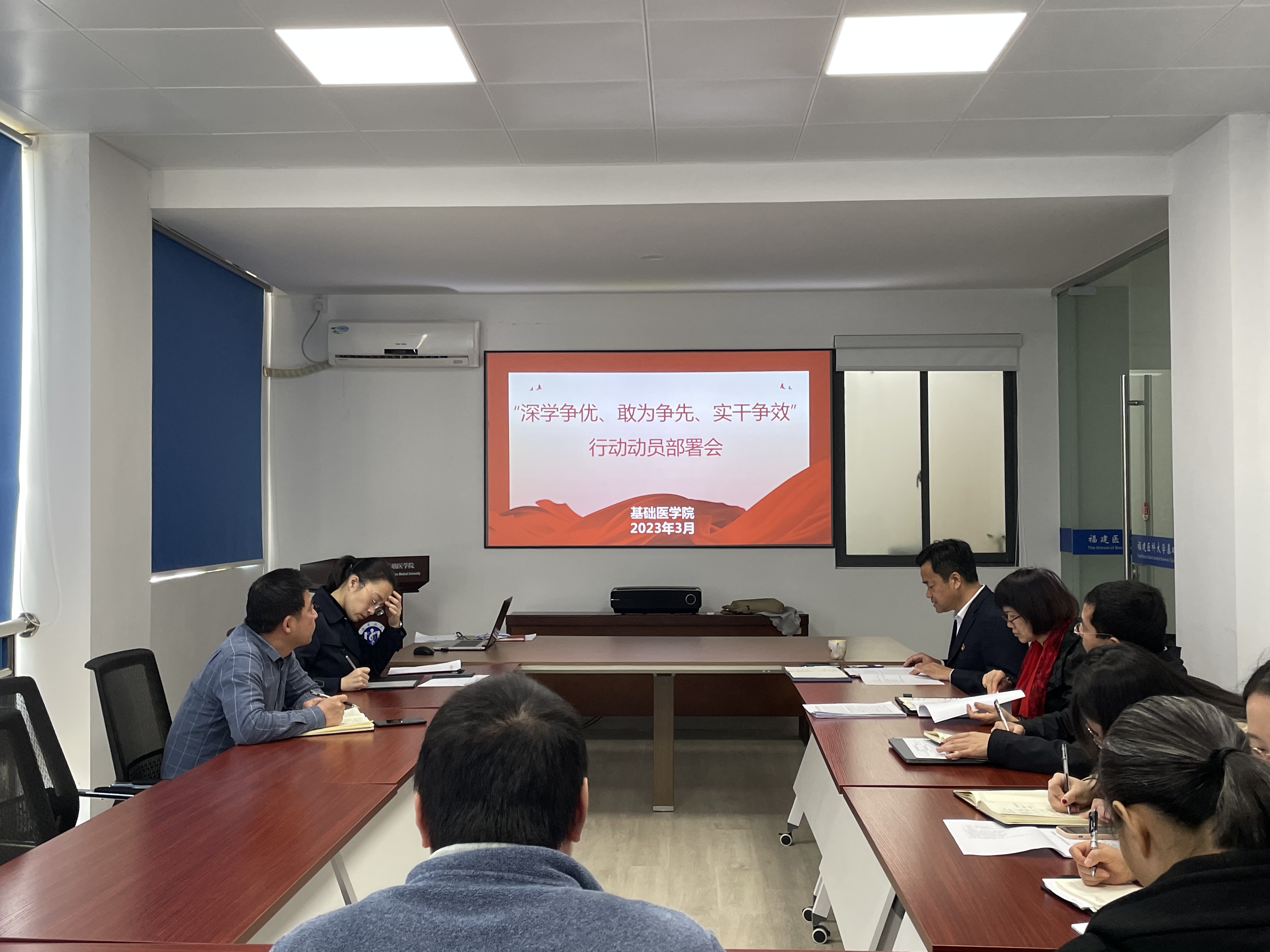 会议传达了学校“深学争优、敢为争先、实干争效”行动动员部署会会议精神,学院党委书记作动员部署讲话。一是深学争优,加强理论武装,把党的二十大精神落到实处。深入学习贯彻习近平新时代中国特色社会主义思想和党的二十大精神,要认真学习贯彻党中央、福建省委和校党委的重大决策部署,学习习近平总书记教育重要论述和习近平总书记对福建工作的一系列重要讲话重要指示批示精神等。二是敢为争先,聚焦学院发展大局,推动改革创新落地见效。严格按照校党委党建和思政工作要求,完善“三全育人”工作格局,全面提高“课程思政”建设质量;凝练党建工作特色品牌,扎实做好学院党建工作标杆院系创建;夯实基层基础,将教工支部与科研团队、实验室的学术研究交叉融合,党建和学科建设、教学改革、社会服务良性互动、相互促进。三是实干争效,强化作风建设,向肯干能干要效益。坚持引育并举,全力引进高层次领军人才,以基础医学研究院成立为契机,加强学科团队建设;抓好学生工作,关爱帮扶特殊群体学生,千方百计推动2023届毕业生就业创业工作。四是师生至上,守好安全底线,全力确保学院大局稳定。要切实提高政治站位,提升政治敏锐性,严格落实意识形态主体责任,严格阵地管理,明确重点环节和关键任务,持续关注师生思想动态,解决师生合理诉求,加强网络舆论正面引导教育,落实安全稳定各项任务,着力保障学院各项工作平稳、有序、持续推进。