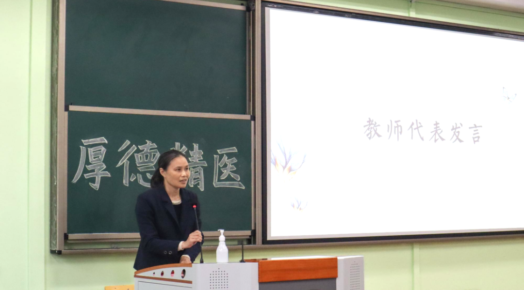 教师代表林如英老师赞扬了同学们在解剖学实践中所展现出的专业素养和才华,表达了对同学即将下临床的殷切希冀,鼓励同学们在下临床的学习过程中始终保持严谨认真的学风。