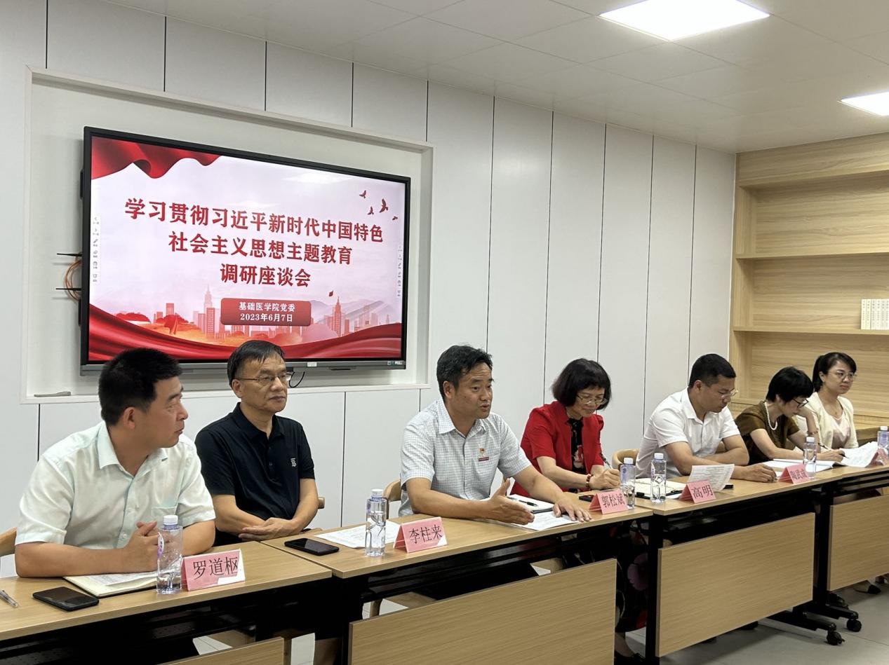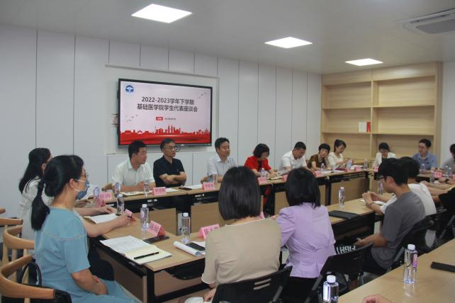 为深入落实党中央关于学习贯彻习近平新时代中国特色社会主义思想主题教育的重大部署和大兴调查研究的重要要求,更好了解广大学生对我院教育教学、管理服务等方面的意见和建议,进一步提高我院教学管理服务水平和教学质量,2023年6月7日下午,基础医学院于6号楼212学生活动室召开学习贯彻习近平新时代中国特色社会主义思想主题教育调研座谈会暨2022-2023学年下学期学生代表座谈会。学院领导班子、校院两级督导、教科办及学工办负责人、各学系/中心主要课程负责人和各专业年级同学代表近40人参加调研座谈会。