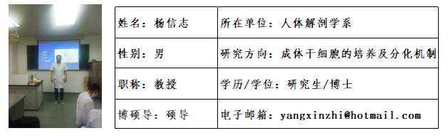 杨信志,男,1967年1月出生,山东即墨人,麻豆视频 人体解剖学系教授, 2004年于日本冈山大学获得博士学位,2011年归国。对哺乳动物的体外受精及早期胚胎的发育有较深入的研究。目前感兴趣的研究领域集中在成体干细胞的研究,对输卵管内膜和子宫内膜干细胞的类器官培养和体外分化有较深入的研究,并在国内外杂志发表多篇相关论文。
