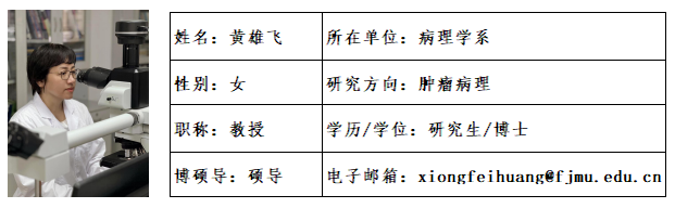 黄雄飞,女,1970年3月生,医学博士,教授,硕士生导师。2005.5-2007.5和 2015.8-2016.7年美国希望之城国家医学中心贝克曼研究所访问学者。长期从事肝脏肿瘤病理相关的科研工作。先后主持国家自然科学基金面上项目,福建省自然科学基金和福建省教育厅等科研课题。在《Cancer Research》等国内外学术期刊发表论文。指导过2名博士研究生和8名硕士研究生的毕业论文相关工作。