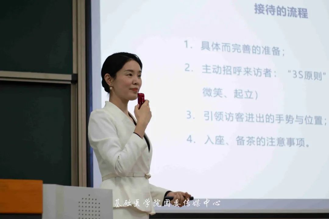 本次培训邀请华夏盛德·礼商书院金牌礼仪讲师张冰老师为同学们带来了办公礼仪方面的培训,提高团委、学生会新成员涵养,张冰老师讲解了礼仪的重要性,并强调礼仪不仅是尊重周围的人,更是学会包容他人。此次培训帮助新成员学习到如何站在对方的角度思考问题,真正做到以礼待人、以礼处事。