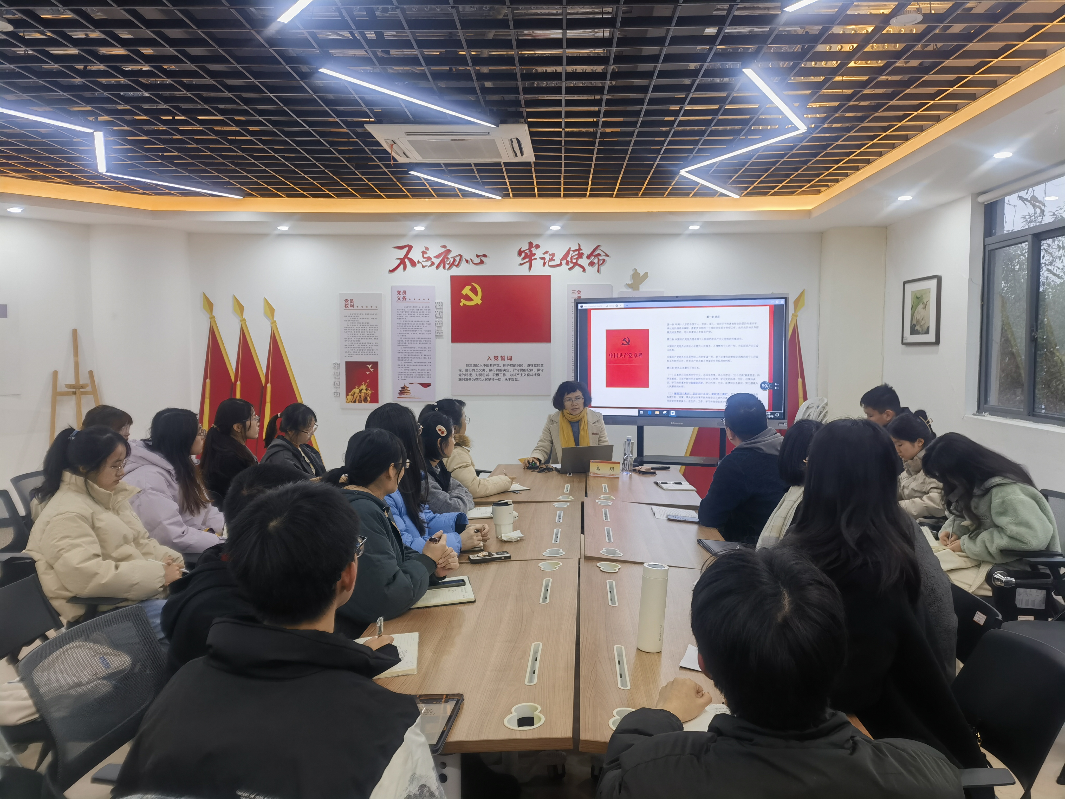 高明书记以《以党员标准要求自己,做合格党员》为主题,结合党章、党史和影像资料,从“入党动机”、“党员的标准”、“大学生怎样成为一名合格党员”三个方面展开党课。她指出,大学生党员应当时常学习党章、党史,对标中国共产党人的初心使命,端正入党动机;对照党员标准,严格要求自己,让优秀成为习惯,努力提升为人民服务的本领,担当时代赋予青年的使命,不负党和国家的殷切期望。
