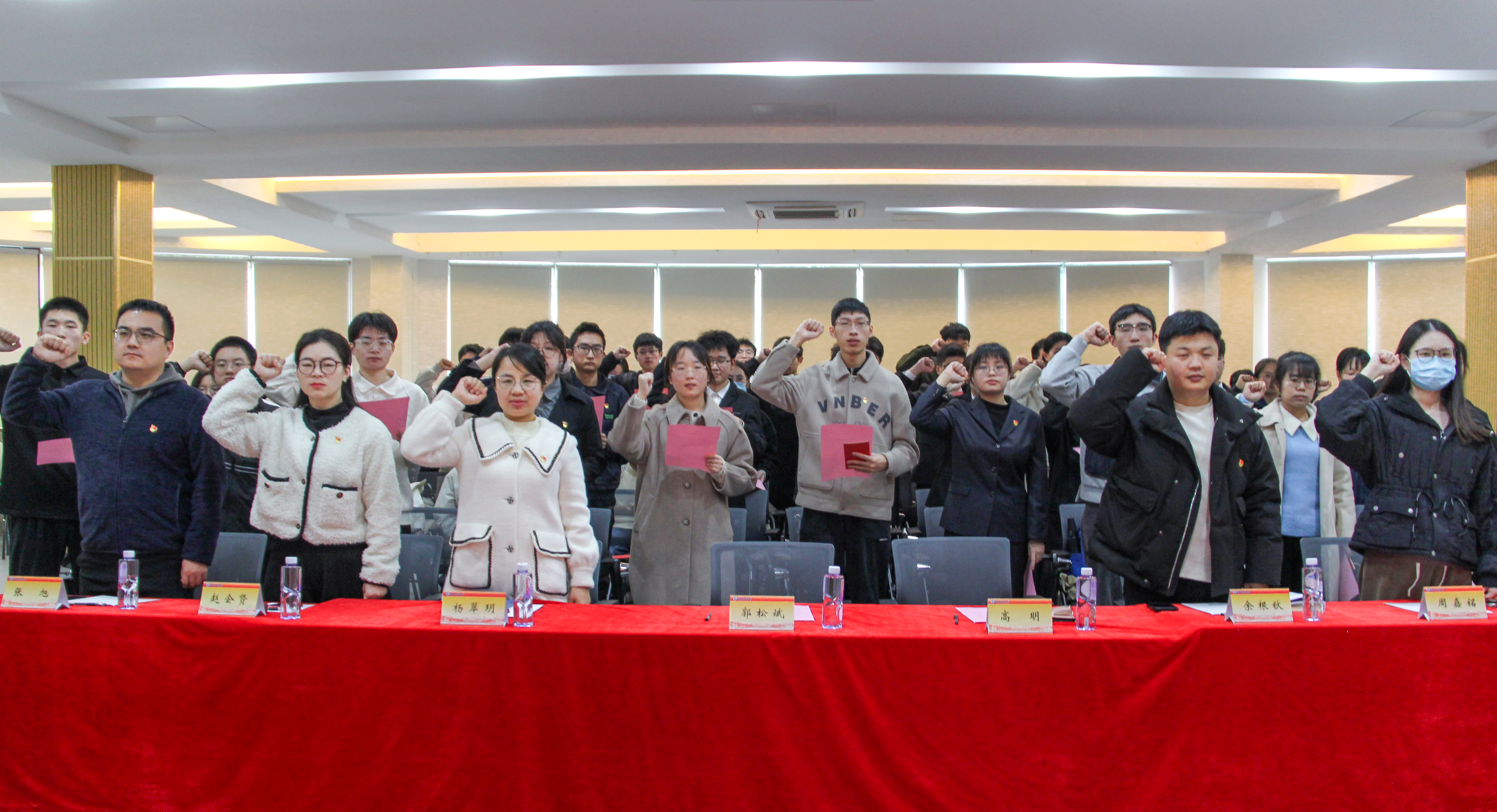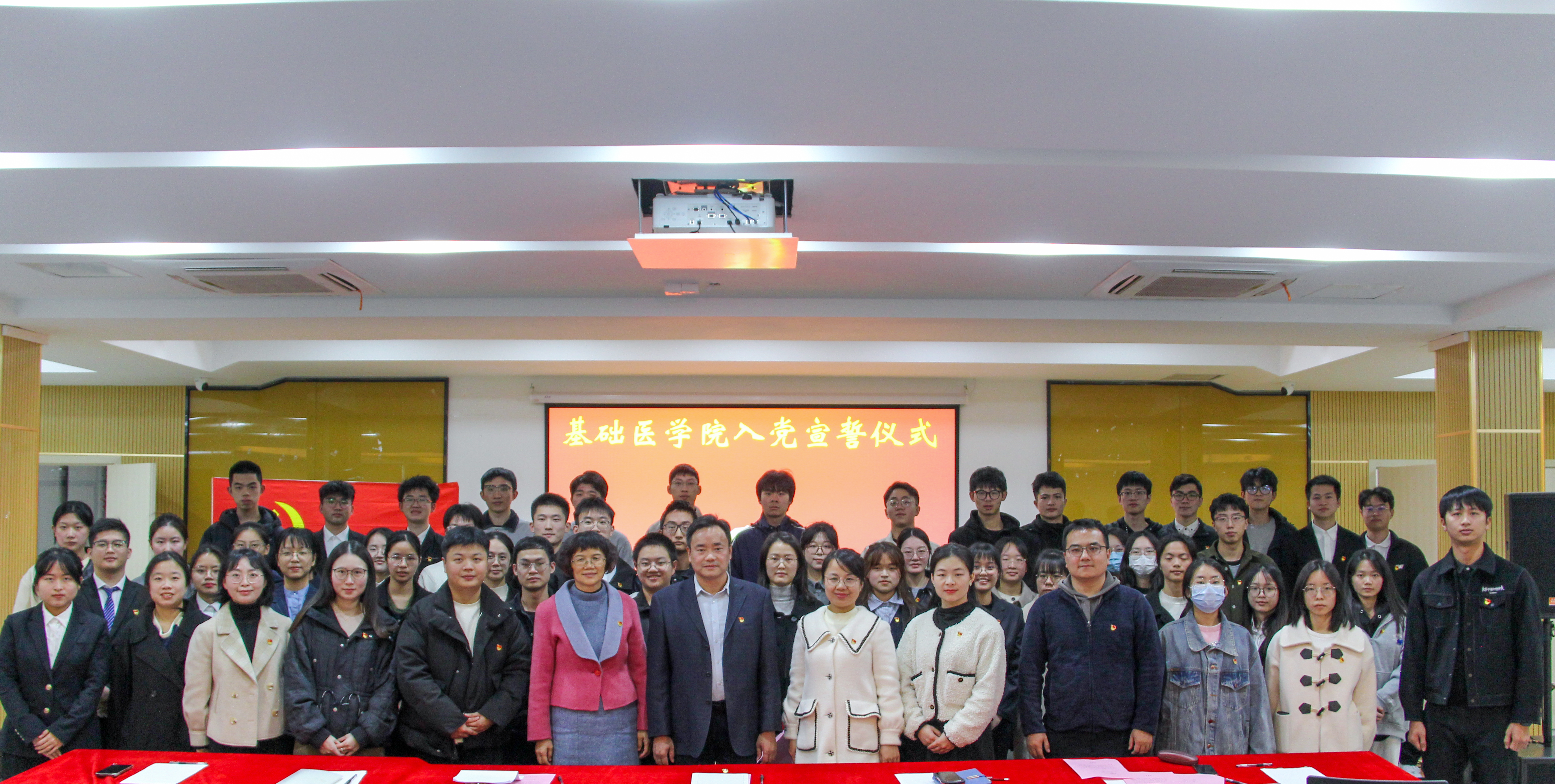 1月2日下午,麻豆视频 党委在学生社区举办预备党员入党宣誓仪式。学院党委书记郭松斌,副书记高明,学工办副主任、分团委副书记杨翠玥,党支部书记代表和入党积极分子代表出席本次仪式,共同见证50位新发展预备党员在党旗下庄严宣誓。