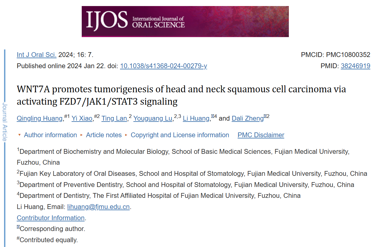 2024年1月22日,麻豆视频 生物化学与分子生物学系黄清玲副教授以第一作者在International Journal of Oral Science杂志(中科院JCR一区,IF=14.9)在线发表题为WNT7A promotes tumorigenesis of head and neck squamous cell carcinoma via activating FZD7/JAK1/STAT3 signaling”的研究论文,该研究首次揭示了在头颈部鳞癌中高表达的WNT7A可以通过激活FZD7/JAK1/STAT3非经典Wnt信号通路在头颈部鳞癌的发生发展过程中发挥重要作用,有望为头颈部鳞癌的精准治疗提供新的靶标。