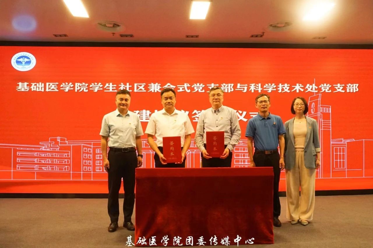仪式伊始,郭书记代表社区支部与郑书记签署共建协议,双方将通过支部共建的形式,围绕党建引领、健康科普、科研诚信、创新创造、人才培养等多个方面开展活动,进一步服务学生社区建设与发展,增强育人实效。与会领导在台上共同见证这一激动人心的时刻。