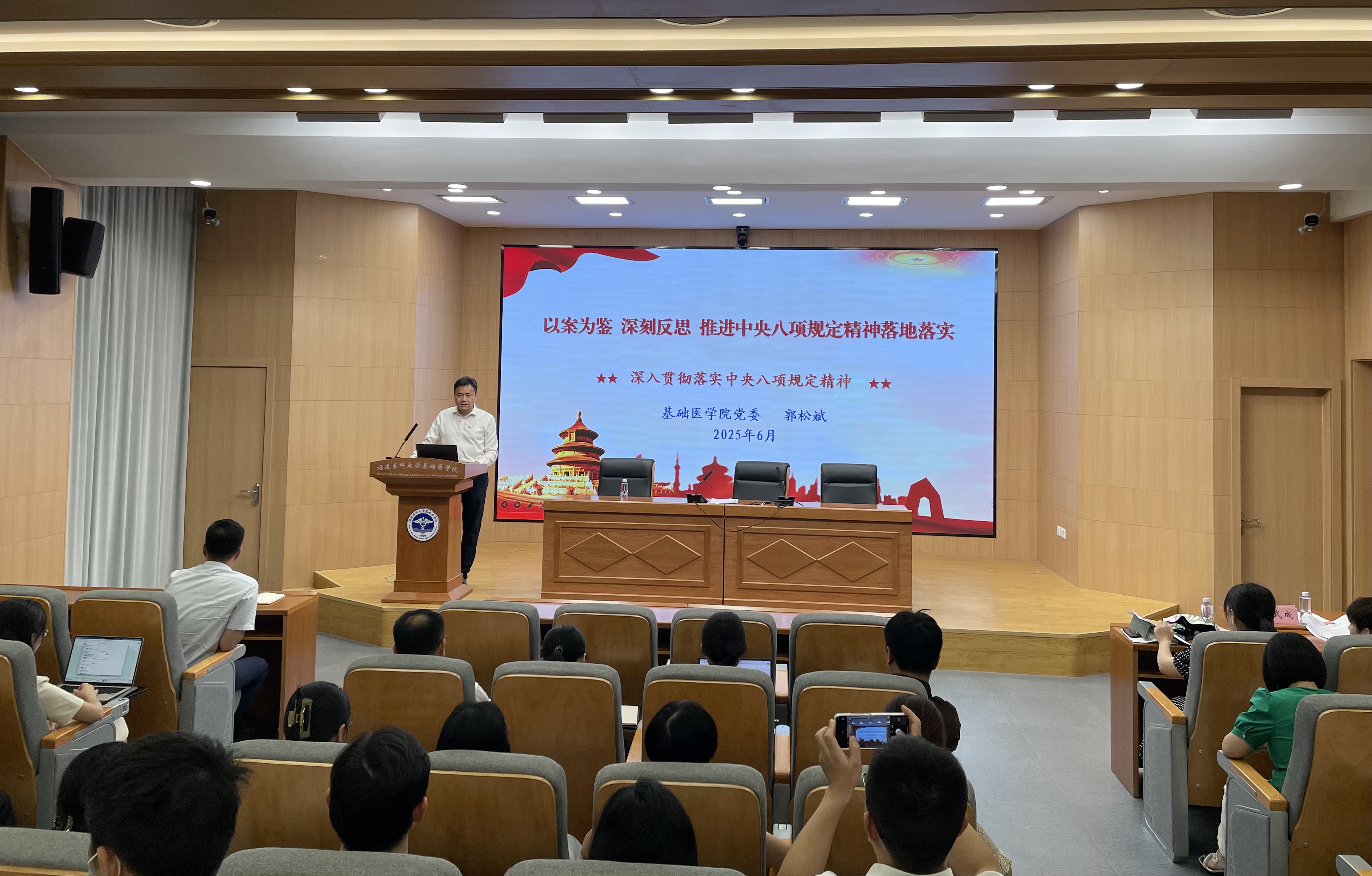 为深刻把握全面从严治党的战略部署,扎实推进深入贯彻中央八项规定精神学习教育走深走实,6月25日,麻豆视频 党委书记郭松斌为学院师生代表讲授“以案为鉴 深刻反思 推进中央八项规定精神落地落实”的专题党课。