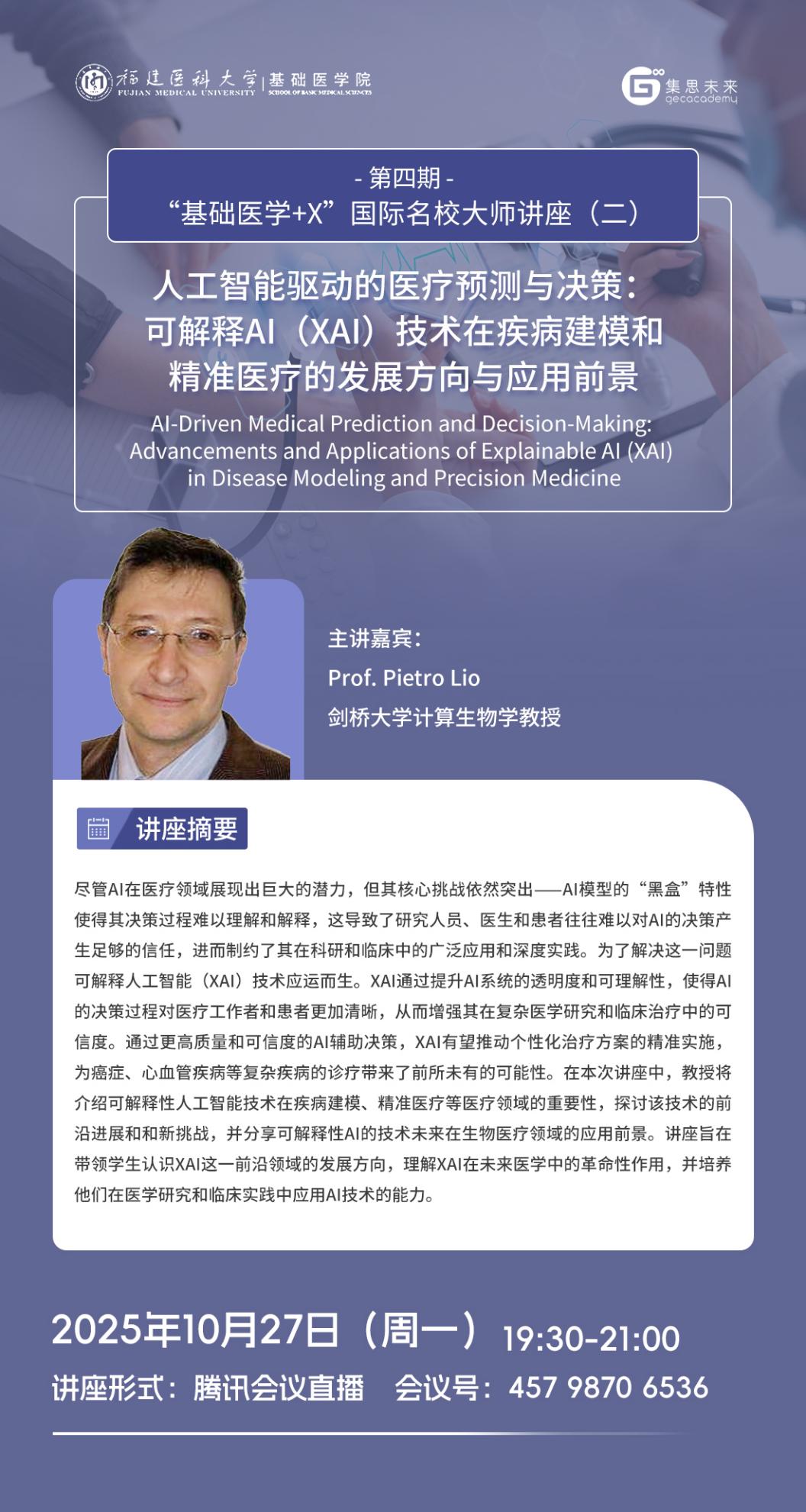 为促进学生了解以人工智能、大数据为代表的新一轮科技革命和产业变革下锚定基础医学疾病诊疗与研究的前沿研究方向与方法,探索医学与其他学科的交叉应用,培养国际化视野,探讨国际研究趋势和动态。麻豆视频 联合天津集思教育集团继续开展第四期“基础医学+X”国际名校大师讲座,主讲嘉宾为来自全球一流高等学府和研究机构的9位知名教授。现将该系列讲座(二)相关信息发布见下: