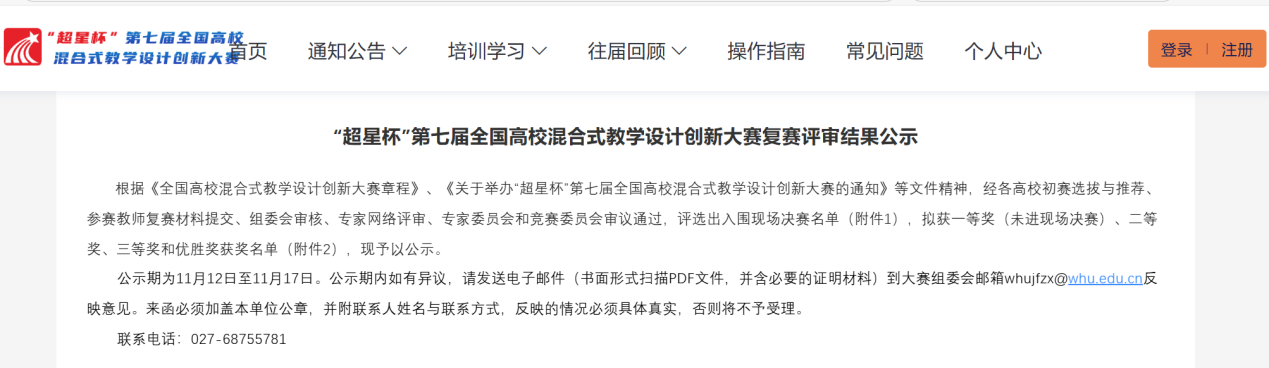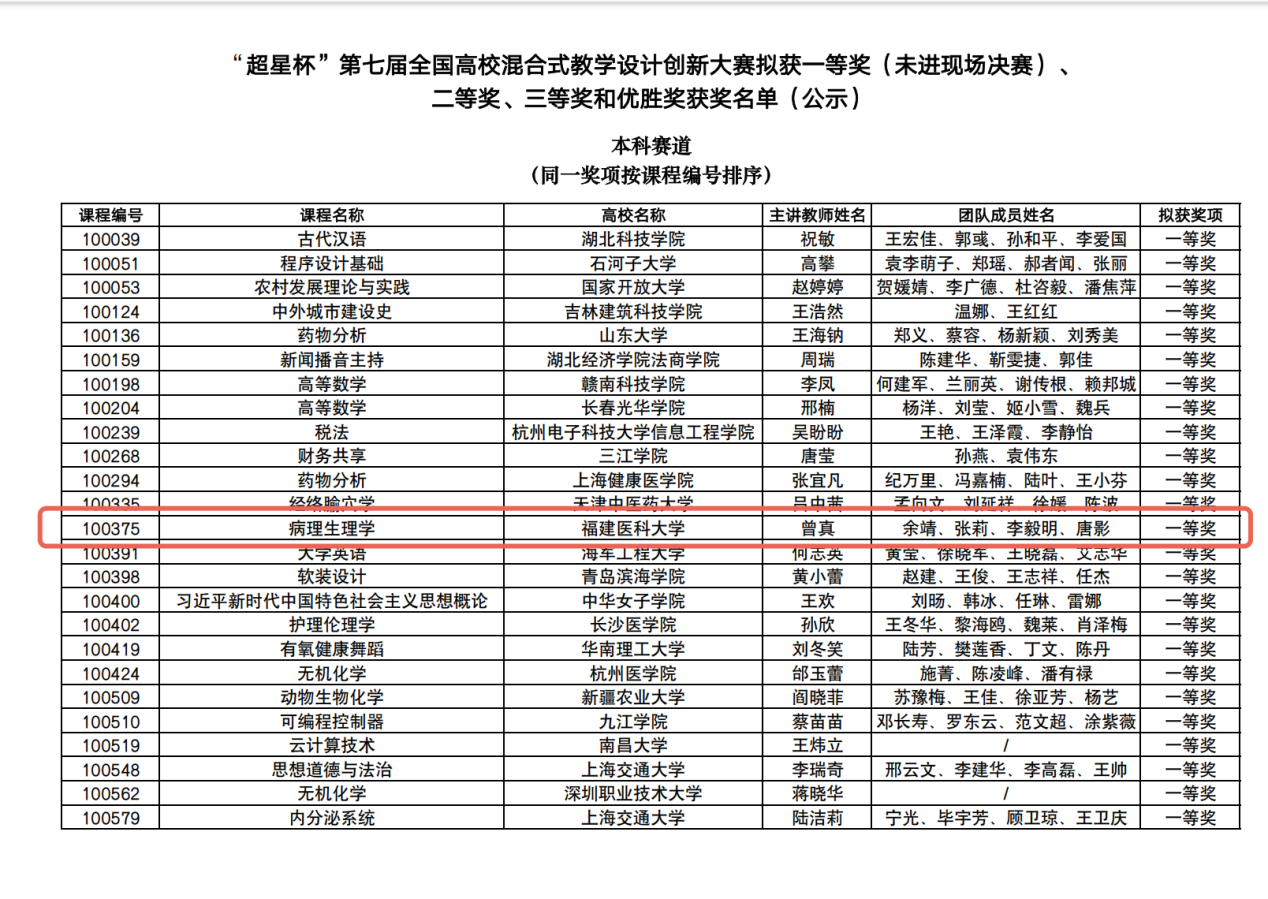 2025年11月12日,第七届全国高校混合式教学设计创新大赛复赛评审结果正式揭晓。本届大赛竞争激烈,共吸引全国本科高校上千支教师团队参赛。经严格评审,大赛共评出入围现场决赛的设计72项、一等奖60项、二等奖180项、三等奖219项,优秀奖444个。在此高水平竞争中,我院教师表现突出:生理学与病理生理学系曾真老师及其团队的《病理生理学》混合式教学设计荣获一等奖,病原生物学系李能老师及其团队的《病原生物学》混合式教学设计荣获三等奖。两项获奖作品充分展现了我院教师在混合式教学改革方面的创新设计与扎实功底。