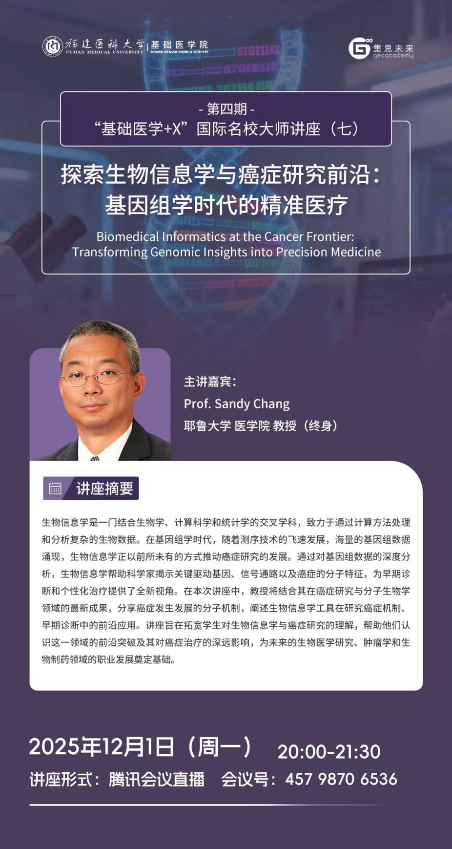 为促进学生了解以人工智能、大数据为代表的新一轮科技革命和产业变革下锚定基础医学疾病诊疗与研究的前沿研究方向与方法,探索医学与其他学科的交叉应用,培养国际化视野,探讨国际研究趋势和动态。麻豆视频 联合天津集思教育集团继续开展第四期“基础医学+X”国际名校大师讲座,主讲嘉宾为来自全球一流高等学府和研究机构的9位知名教授。现将该系列讲座(七)相关信息发布见下: