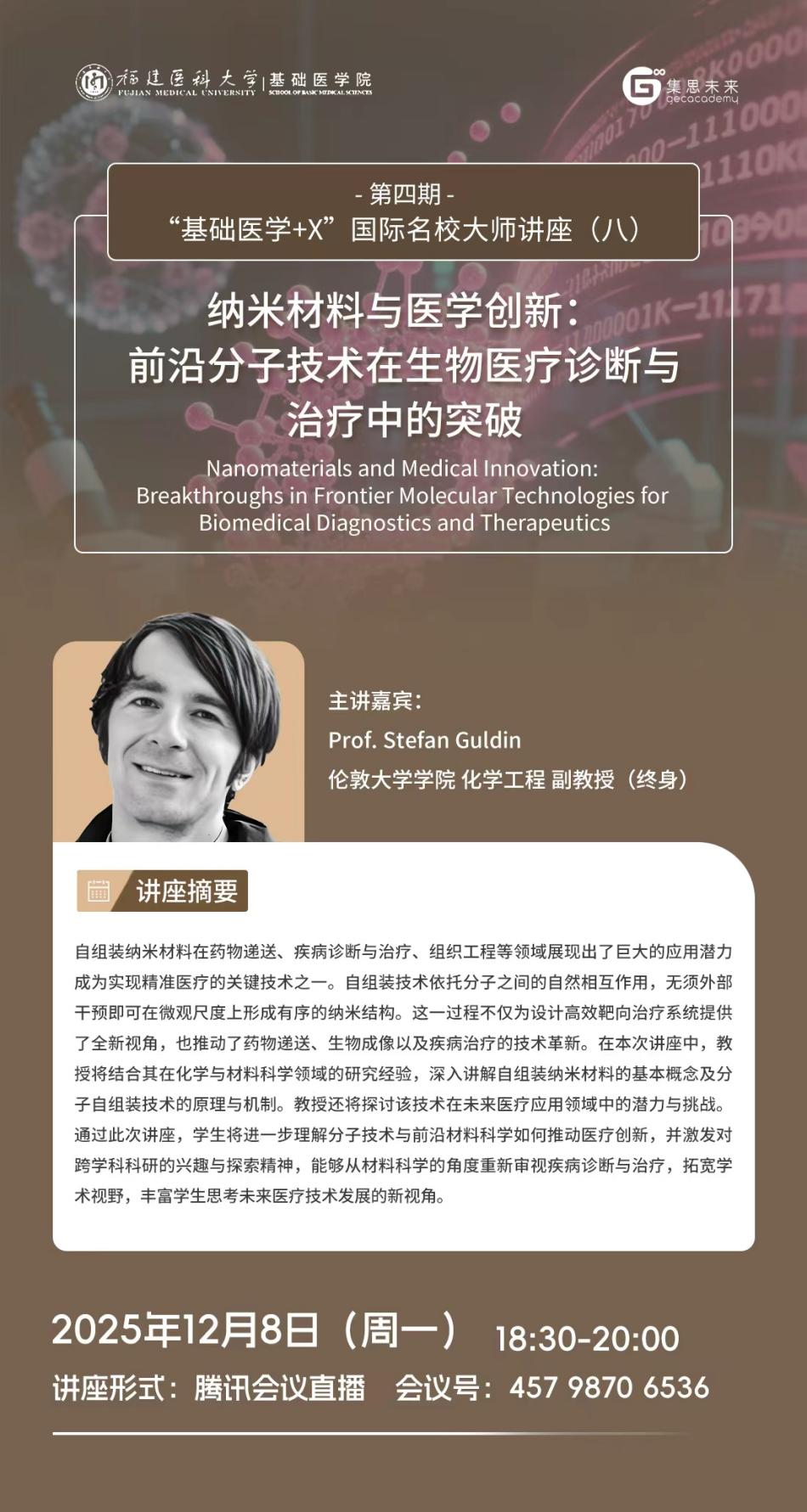 为促进学生了解以人工智能、大数据为代表的新一轮科技革命和产业变革下锚定基础医学疾病诊疗与研究的前沿研究方向与方法,探索医学与其他学科的交叉应用,培养国际化视野,探讨国际研究趋势和动态。麻豆视频 联合天津集思教育集团继续开展第四期“基础医学+X”国际名校大师讲座,主讲嘉宾为来自全球一流高等学府和研究机构的9位知名教授。现将该系列讲座(八)相关信息发布见下: